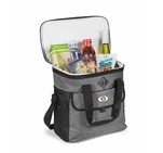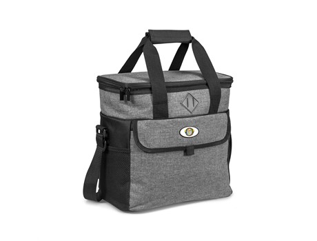 31 ( w ) x 17 ( d ) x 31 ( h ) polycanvas & 600D with PEVA lining. • recessed plaque for domed sticker application attached to cooler • adjustable shoulder strap Elegant with beautiful black and grey contrast. Holds up to 24 cans. Main zippered compartment with PEVA lining. Front pocket with flap. Side mesh pocket. Double reinforced handles with Velcro handle wrap. Adjustable shoulder strap. Recessed plaque for domed sticker application attached to cooler.